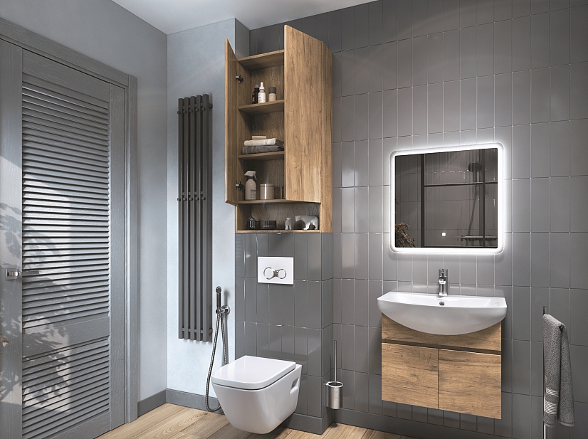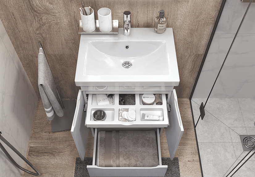 Пространство под умывальником — ключевая зона для закрытого хранения. Сюда удобно помещать бытовую химию, запасные средства гигиены и другие предметы, которые не должны быть на виду. Вместительная тумба под раковиной для хранения — идеальный вариант. Выбирайте конфигурацию в зависимости от целей. К примеру, уходовую косметику удобнее хранить в выдвижном ящике. Так найти нужную баночку будет намного проще. Фены, электробритвы и другие бытовые приборы также хорошо располагаются в ящиках. Для хранения высоких флаконов больше подходят полки. Либо можно рассмотреть комбинированные варианты, как в коллекции Grani. Каждая тумба дополнена специальным выдвижным органайзером, и это лучший вариант для хранения важных мелочей.