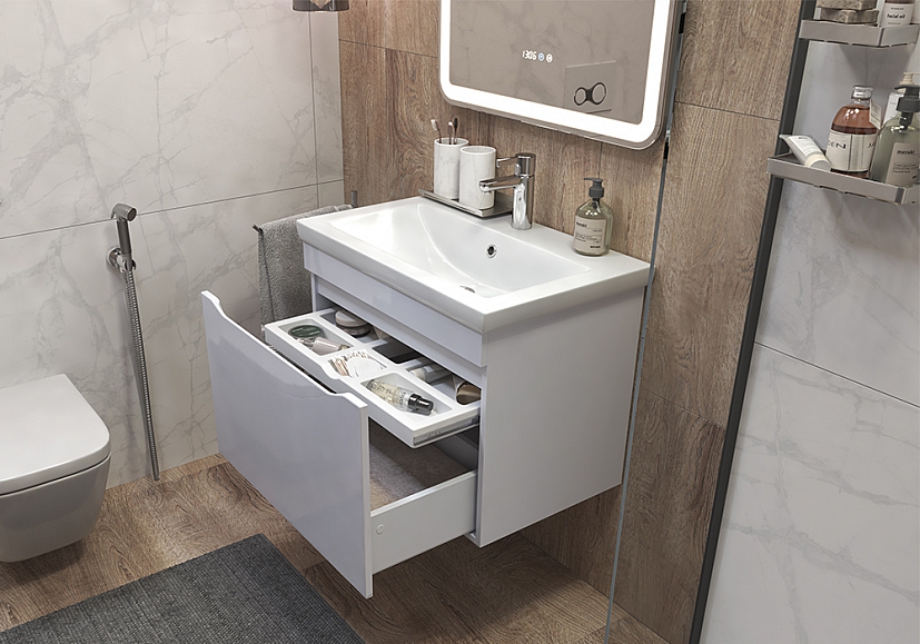 Невидимые технологии в интерьере, когда все лишнее спрятано, а на виду остается только красота и порядок. Скрытые системы хранения позволяют разместить все необходимое так, что визуальному шуму просто не остается места. В тумбах коллекции Grani есть все для чистоты и порядка: вместительные ящики, удобные полки и выдвижной органайзер для важных мелочей. А еще возможность выбора способа размещения. Подвесные модели мебели и сантехники создают визуальную легкость и облегчают уборку, что особенно важно, если вы хотите создать гибкие пространства в квартире.