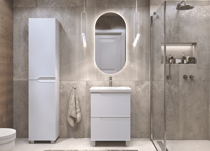 - Тумба до 50–60 см — ваш выбор. Коллекция Wing предлагает отличные решения для таких условий. Тумба оптимального размера позволяет сохранить достаточно пространства для свободного прохода, даже имея минимальные расстояния в ванной комнате.