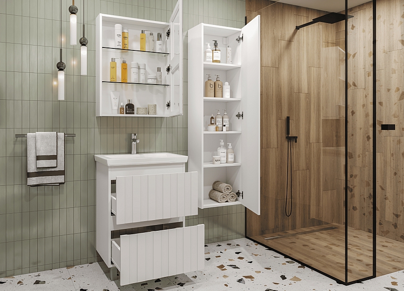 - Минимальная ширина пенала для ванной комнаты составляет около 30-35 см. Это позволяет разместить его даже в узких местах. Например, пенал Finlay имеет оптимальную ширину для большинства ванных комнат.