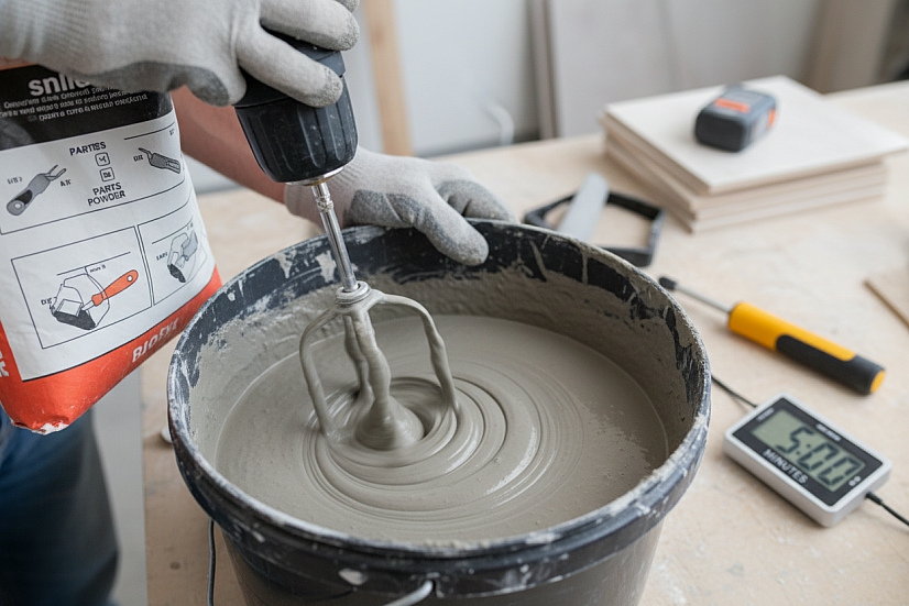 Здесь все просто: внимательно читаем инструкцию на упаковке. Производитель лучше всех знает, сколько воды нужно добавить к сухой смеси. Используйте дрель-миксер на малых оборотах, чтобы получить однородную массу. Дайте смеси «отдохнуть» минут 5-10, а потом еще раз перемешайте. Так затирка станет более пластичной и удобной в работе.