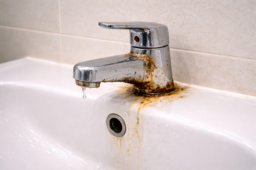 - Ржавчина. Появляется, если на смесителе долго лежали металлические предметы (например, бритва) или из-за плохого качества воды. Выглядит как рыжие или коричневые пятна.