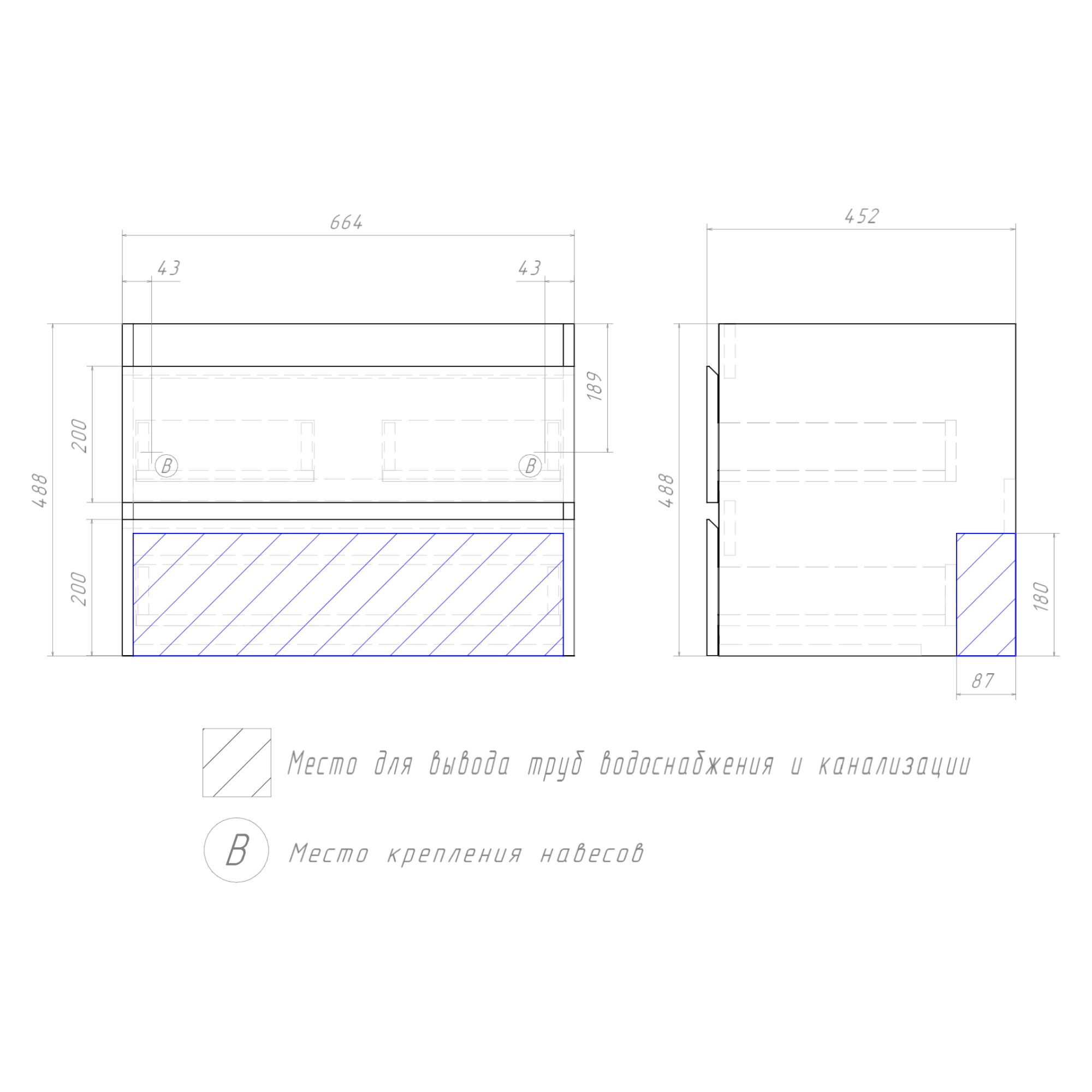 Оснащение: 2 выдвижных ящика, направляющие скрытого монтажа, 2 навеса. Поставка в разобранном виде