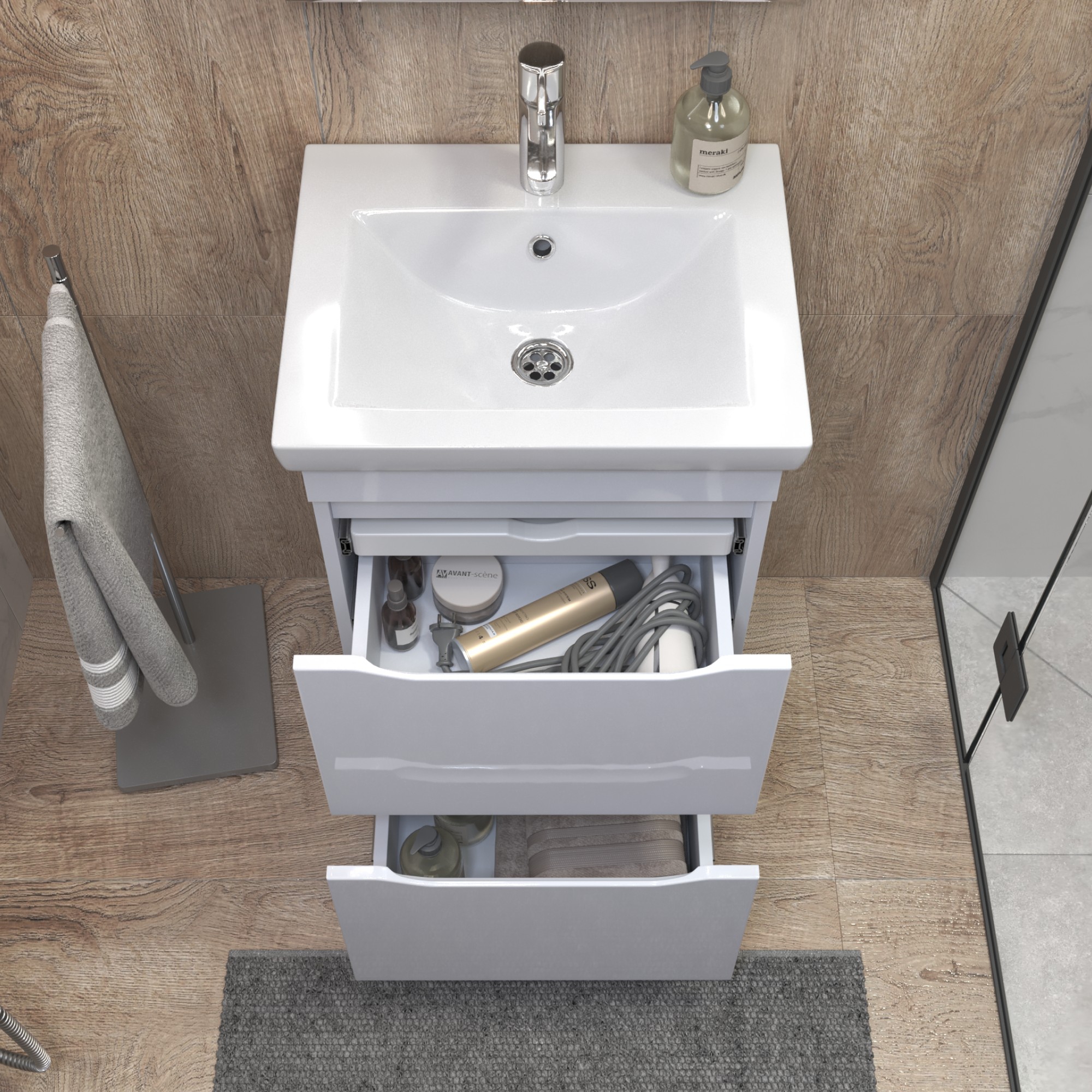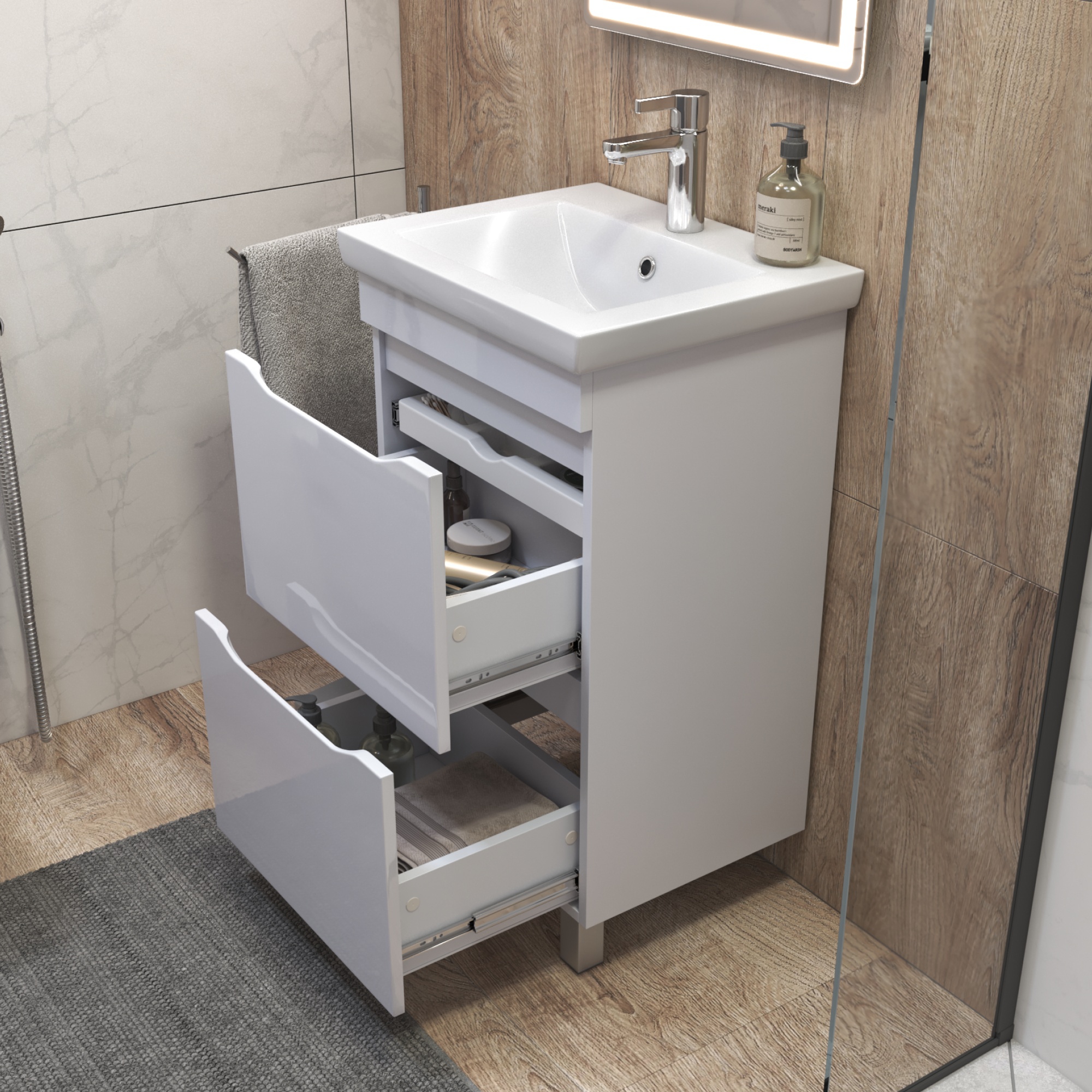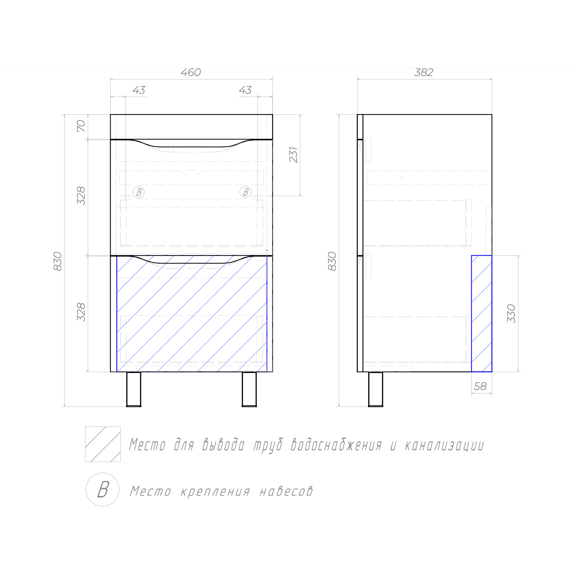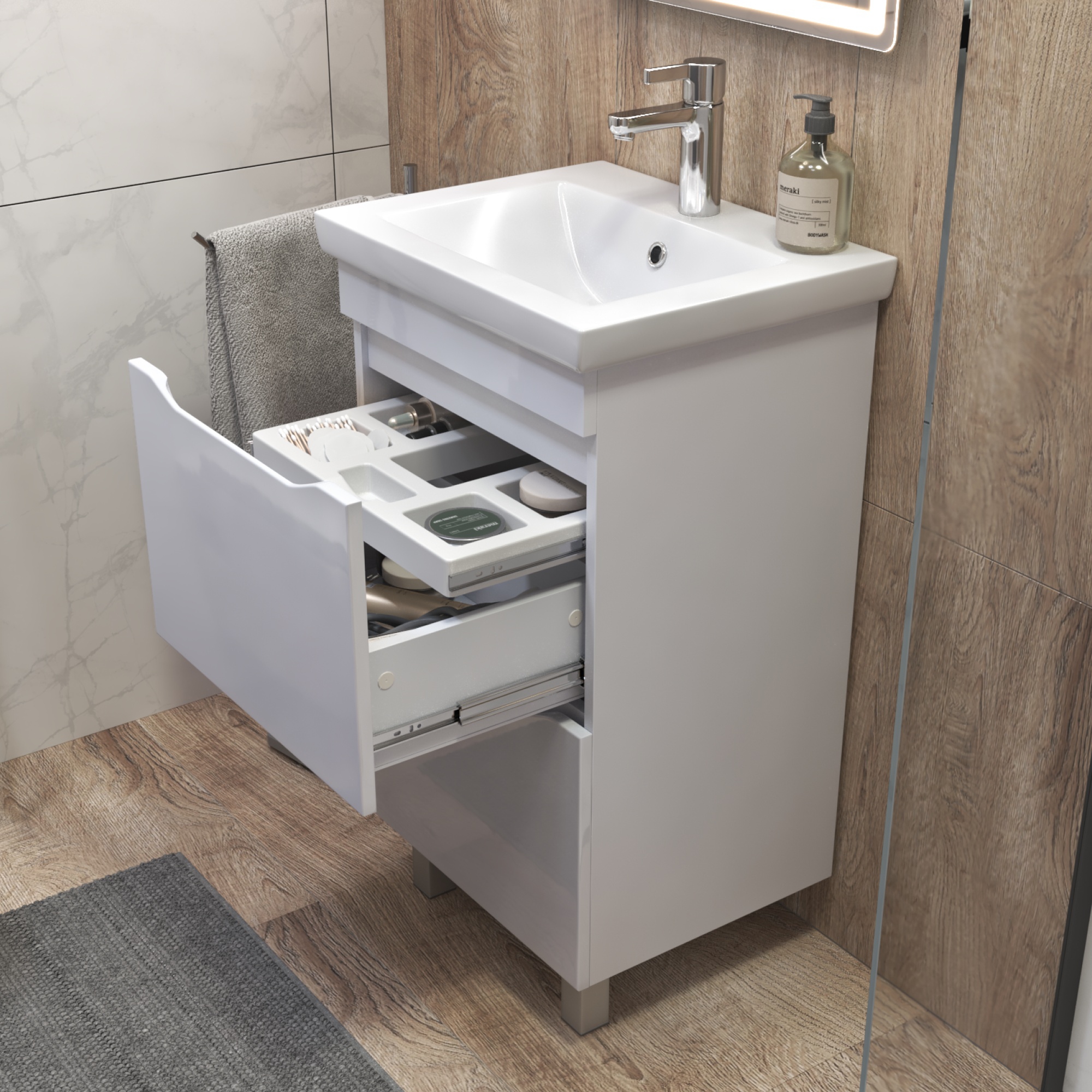 Оснащение:   2 ящика, выдвижной органайзер для мелочей, шариковые направляющие полного выдвижения, 2 опоры квадратные регулируемые, 2 навеса, 1 сифон