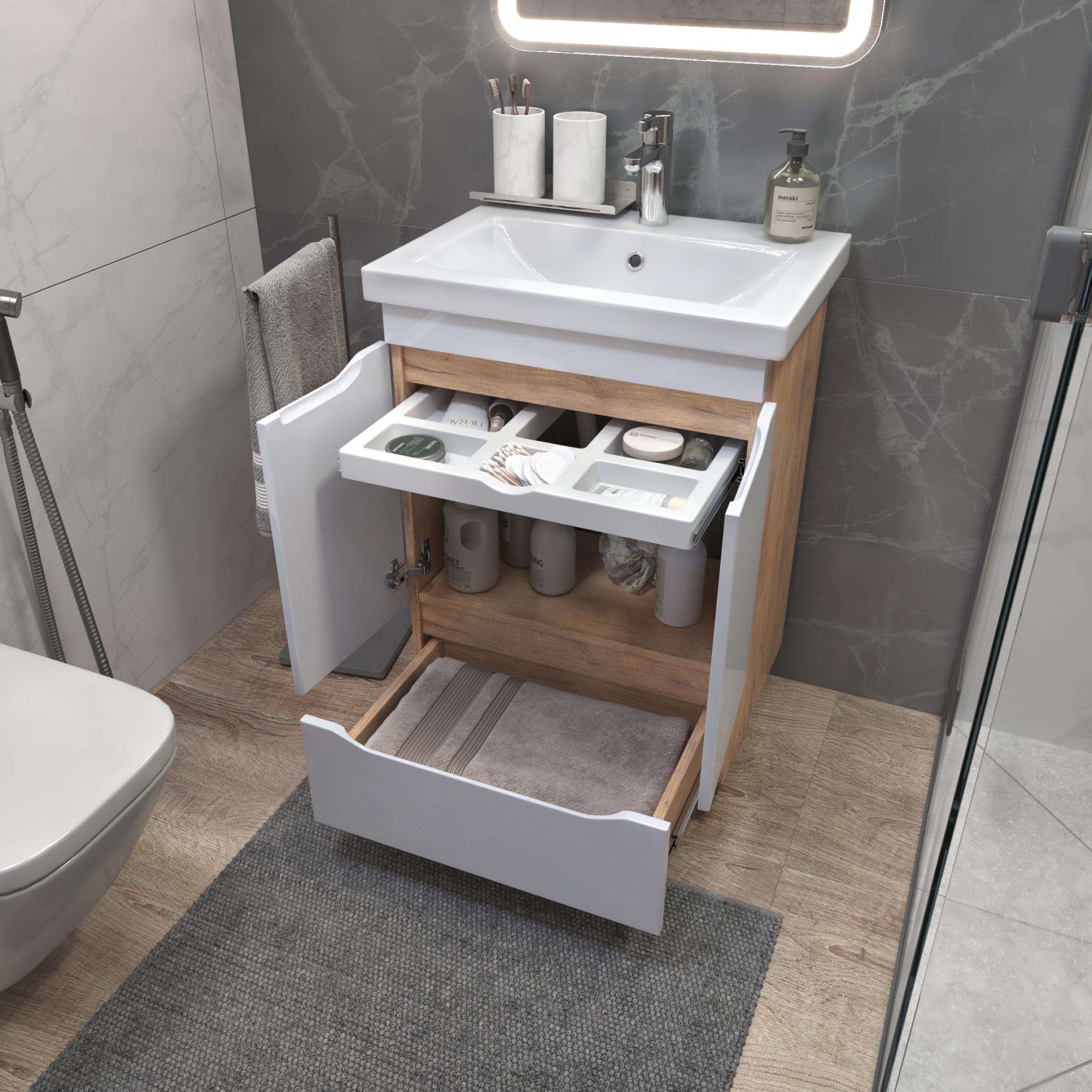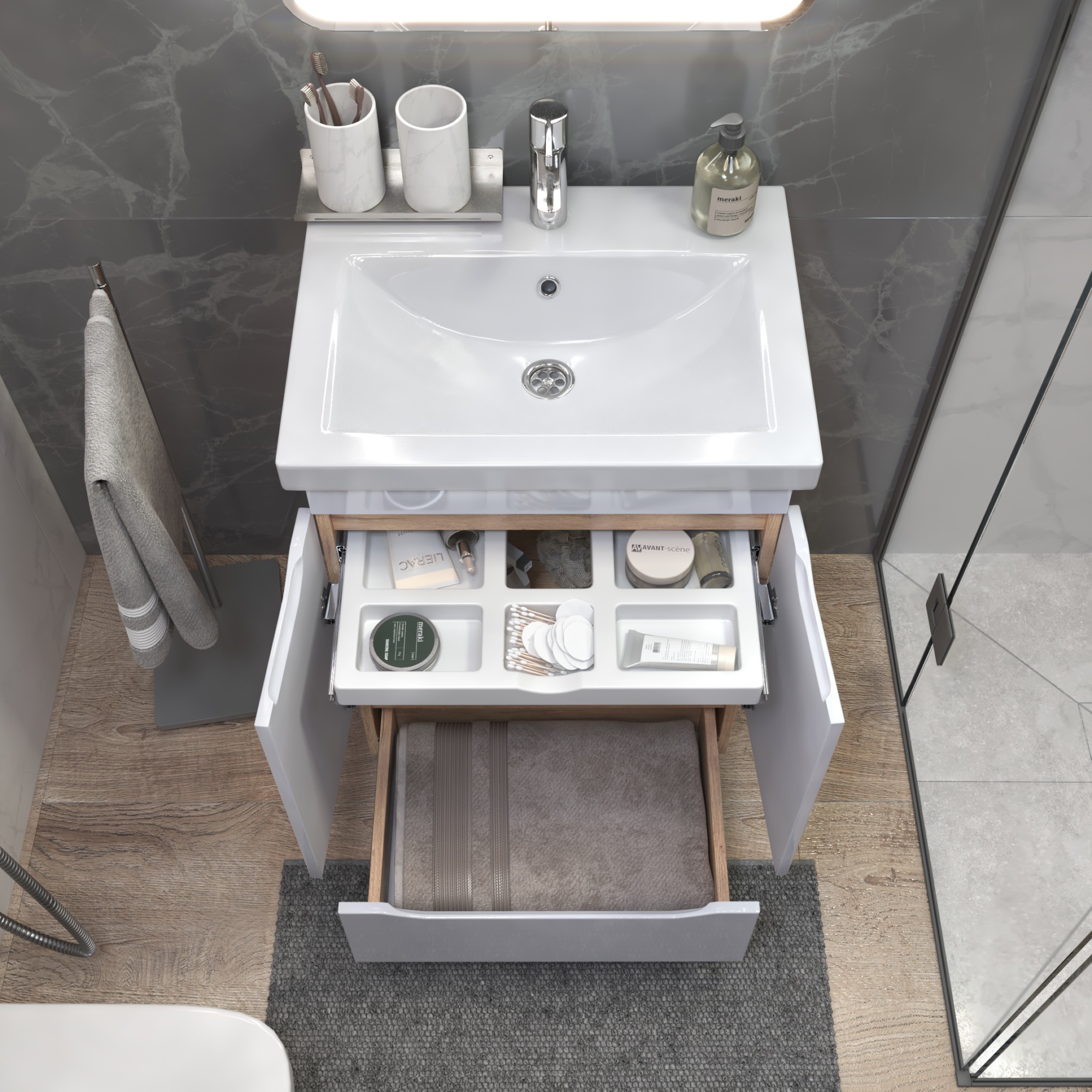 Тумбы Grani оснащены удобным органайзером, который позволяет легко находить и доставать необходимые вещи. Мебель оснащена шариковыми направляющими полного выдвижения, что обеспечивает плавный и бесшумный ход ящика. Еще более комфортное использование мебели делают интегрированные ручки и дверные петли с доводчиком.