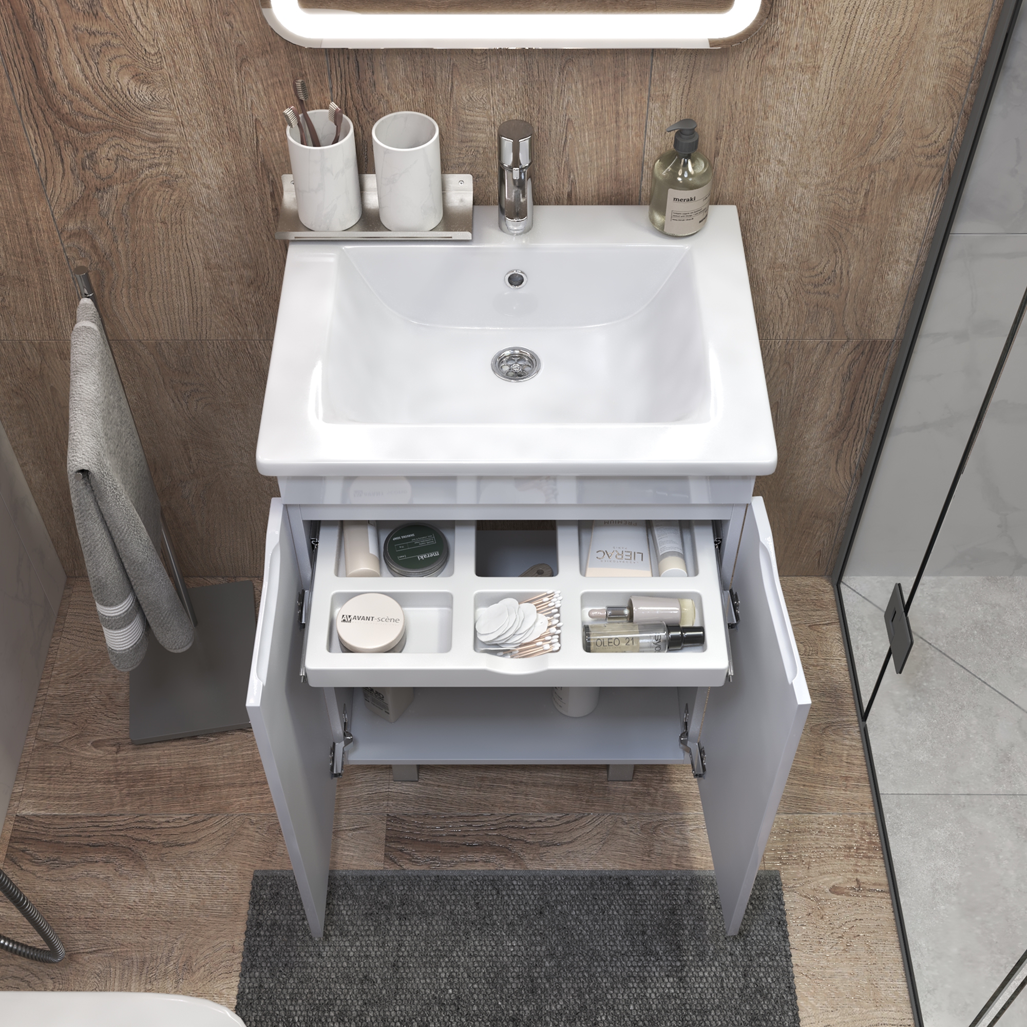 Тумбы Grani оснащены удобным органайзером, который позволяет легко находить и доставать необходимые вещи. Мебель оснащена шариковыми направляющими полного выдвижения, что обеспечивает плавный и бесшумный ход ящика. Еще более комфортное использование мебели делают интегрированные ручки и дверные петли с доводчиком.