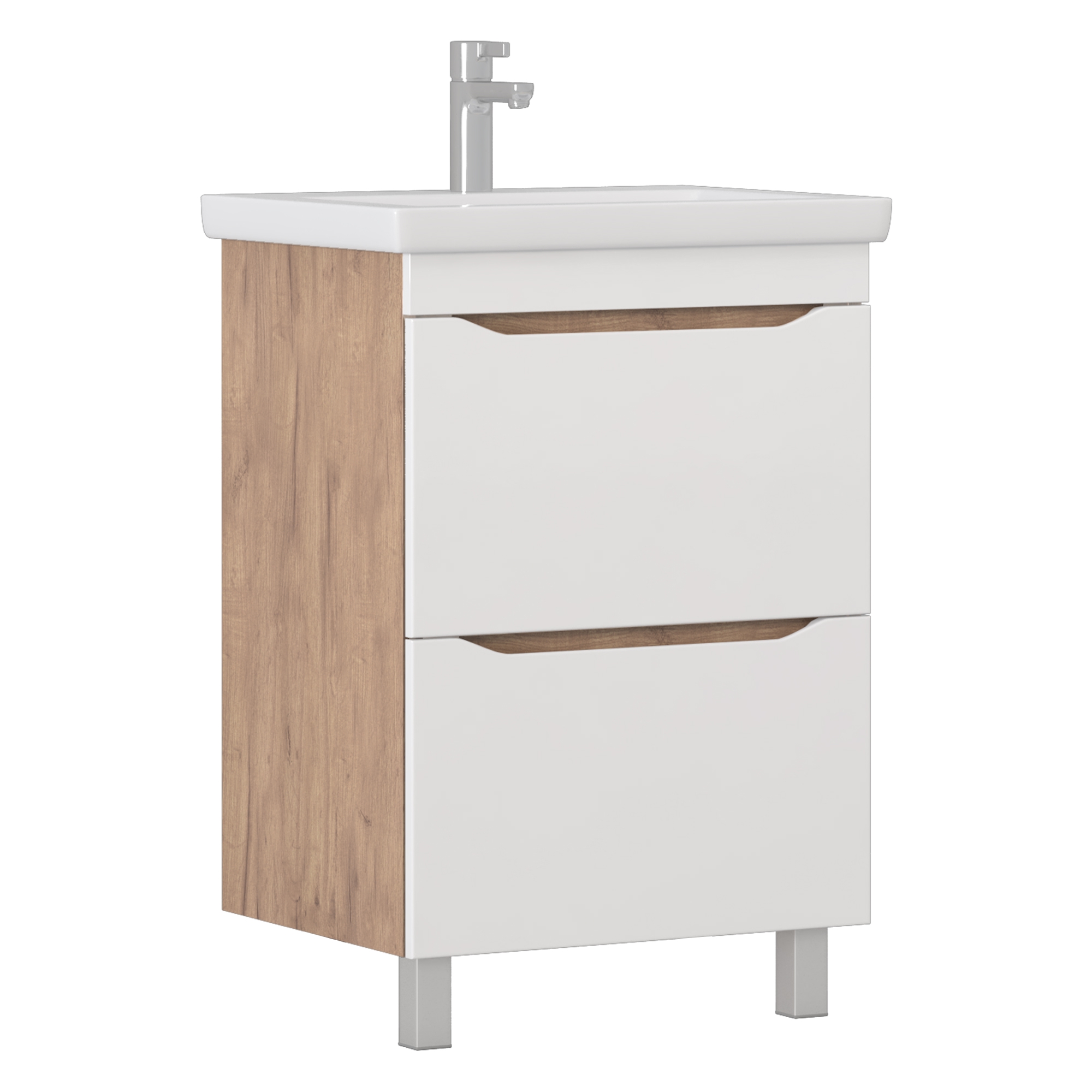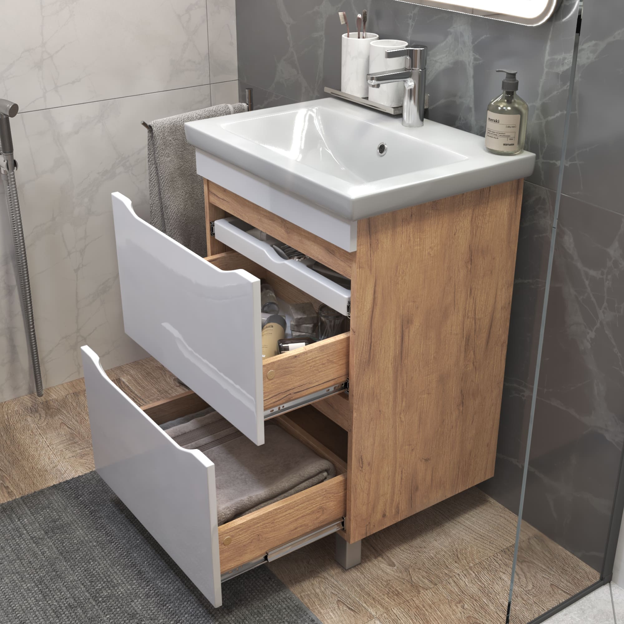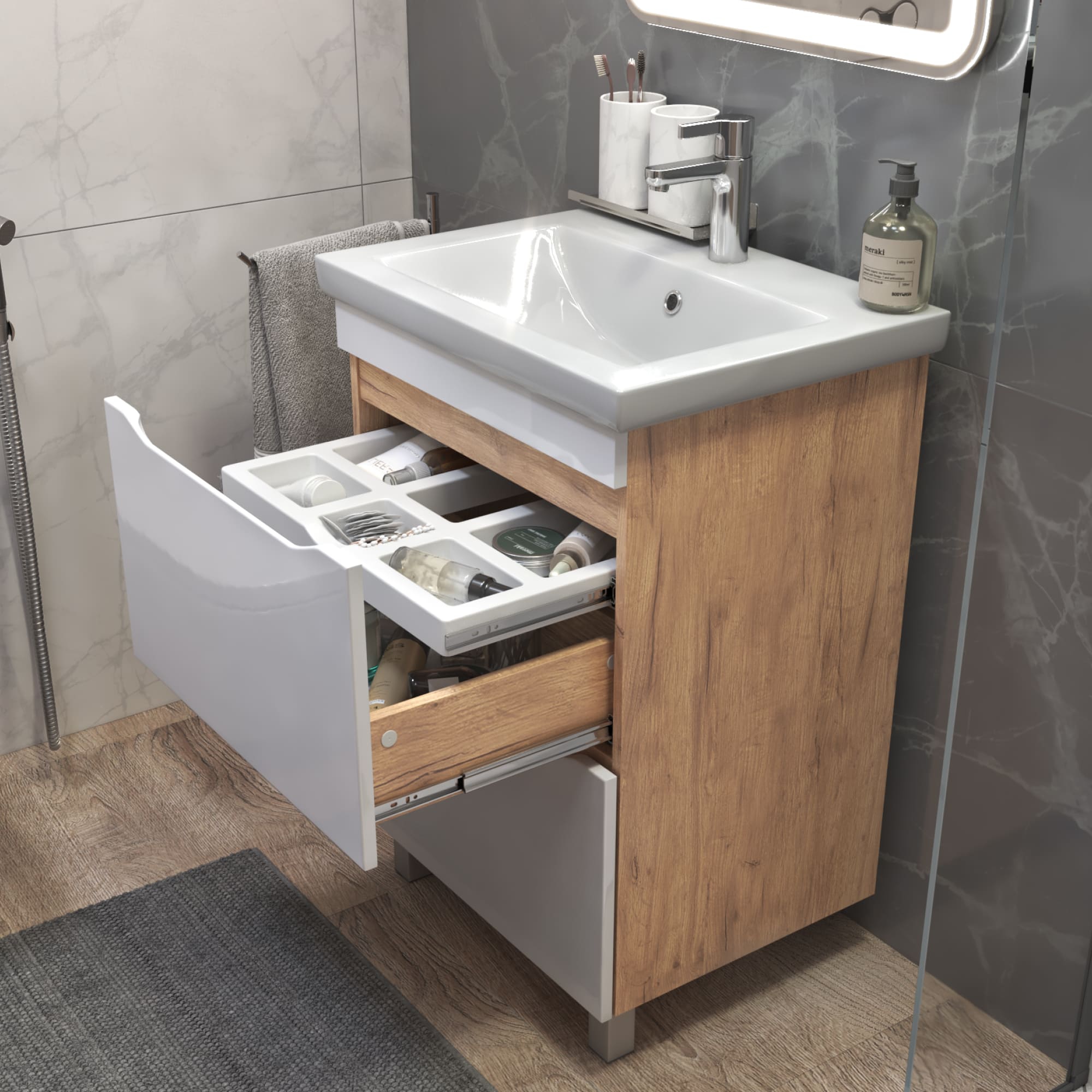 Оснащение: 2 ящика, выдвижной органайзер для мелочей, шариковые направляющие полного выдвижения, 2 опоры квадратные регулируемые, 2 навеса, 1 сифон