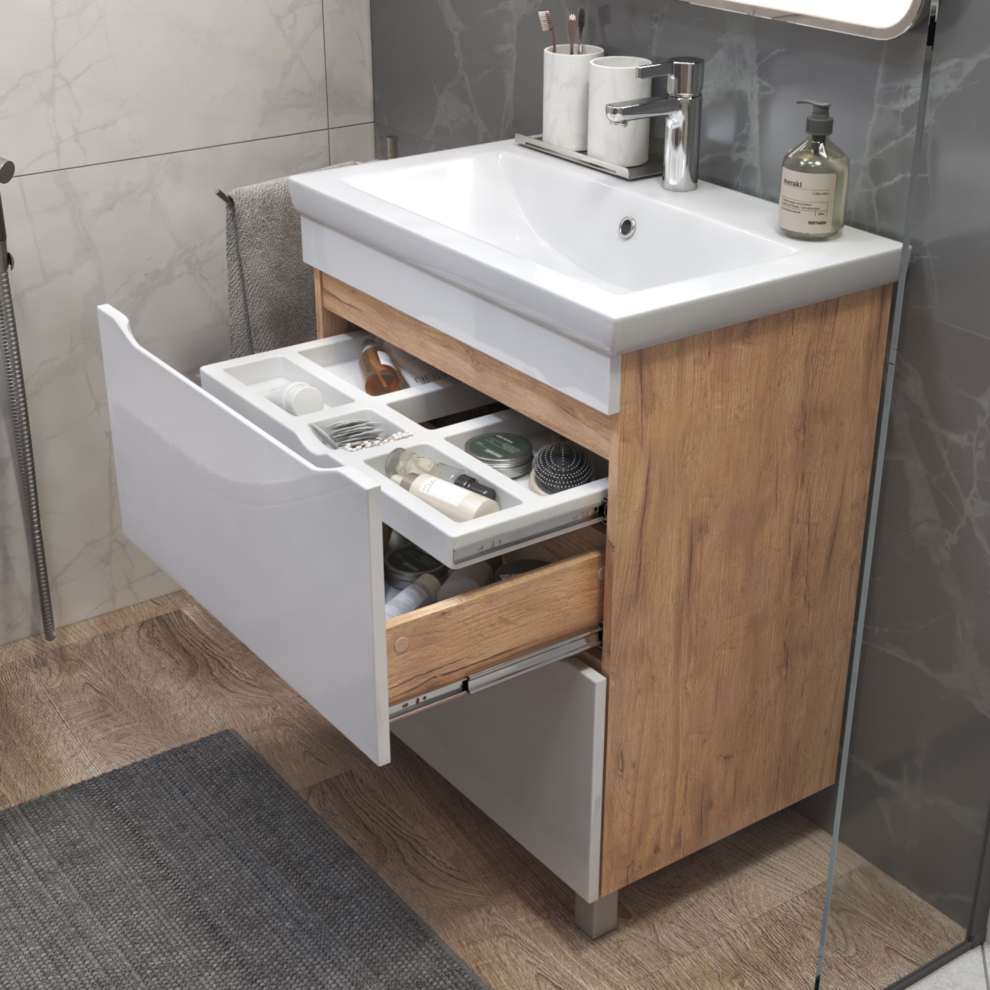 Тумбы Grani оснащены удобным органайзером, который позволяет легко находить и доставать необходимые вещи. Мебель оснащена шариковыми направляющими полного выдвижения, что обеспечивает плавный и бесшумный ход ящика. Еще более комфортное использование мебели делают интегрированные ручки и дверные петли с доводчиком.