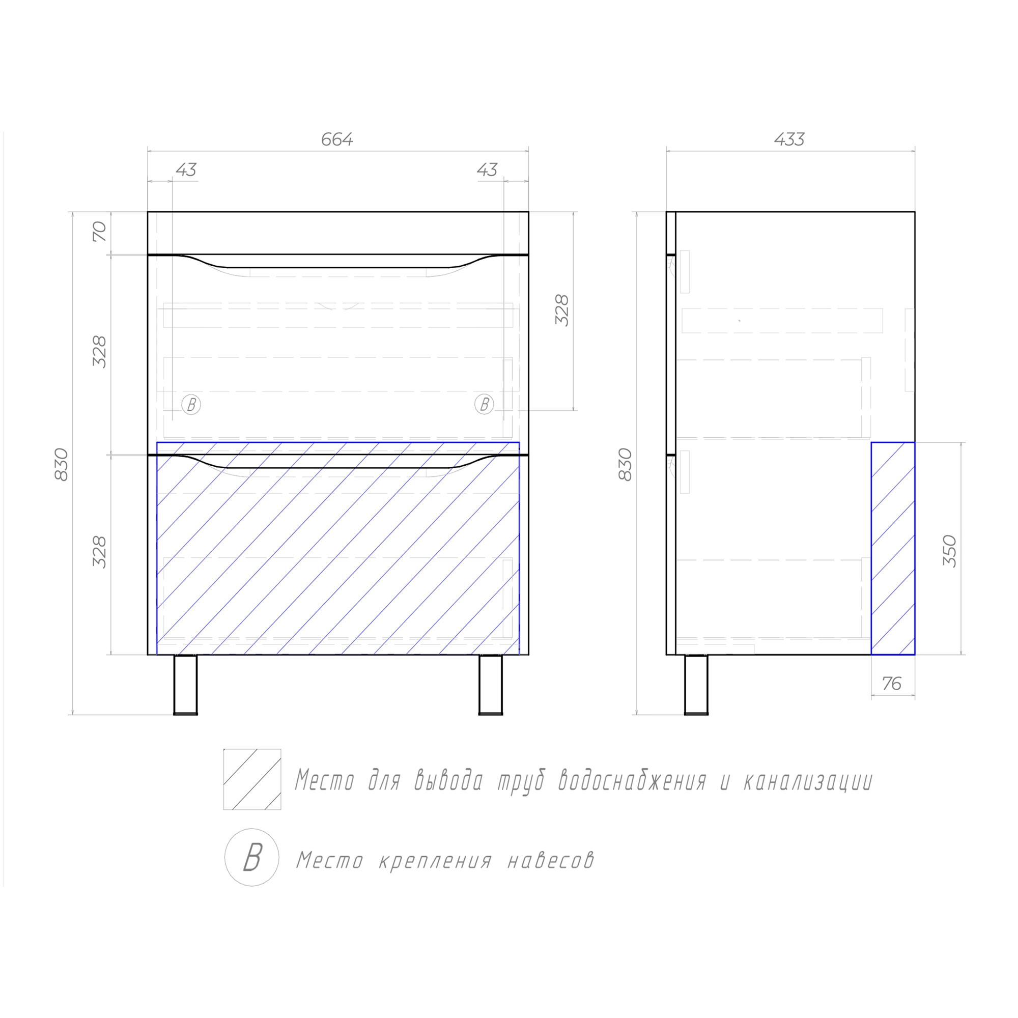 Оснащение: 2 ящика, выдвижной органайзер для мелочей, шариковые направляющие полного выдвижения, 2 опоры квадратные регулируемые, 2 навеса, 1 сифон