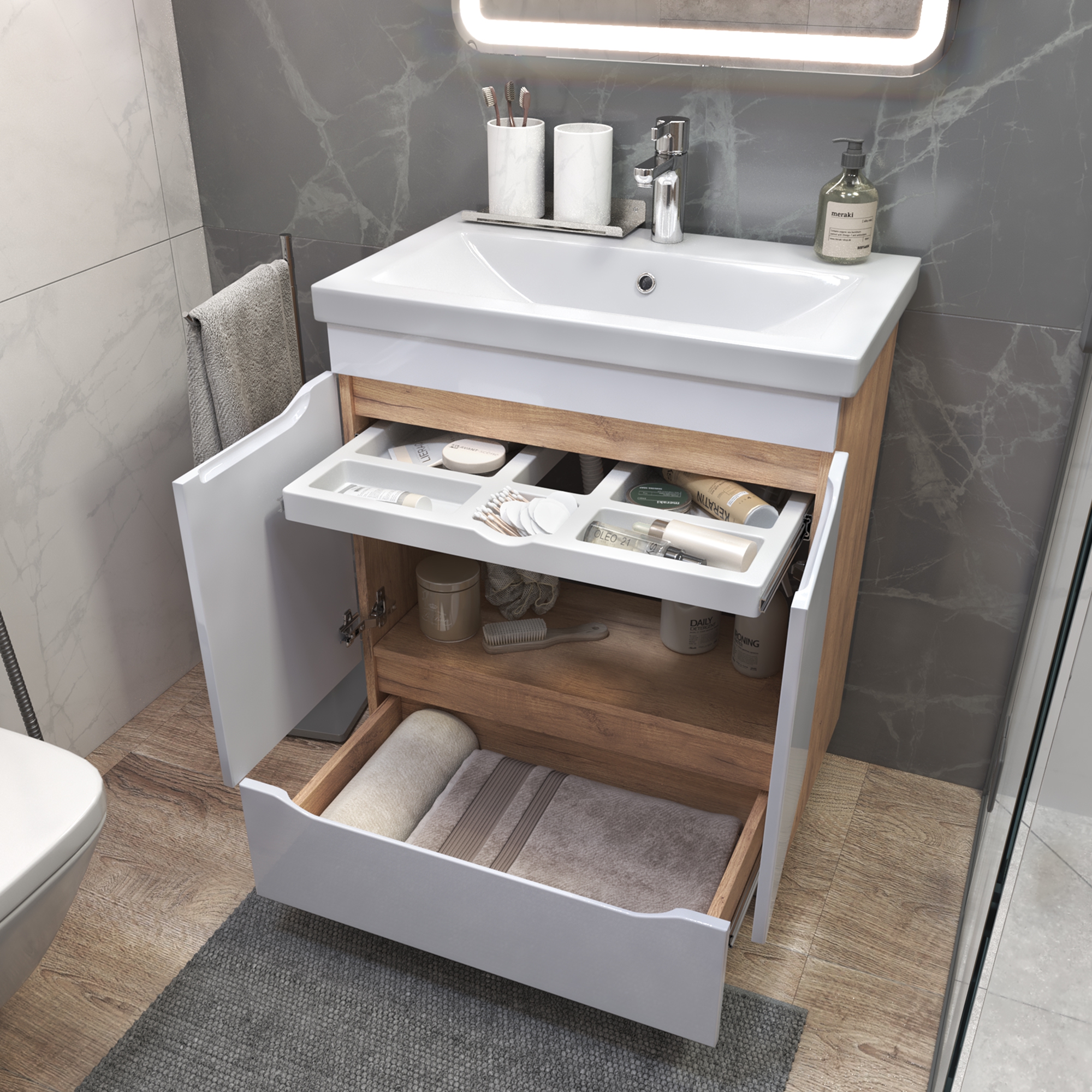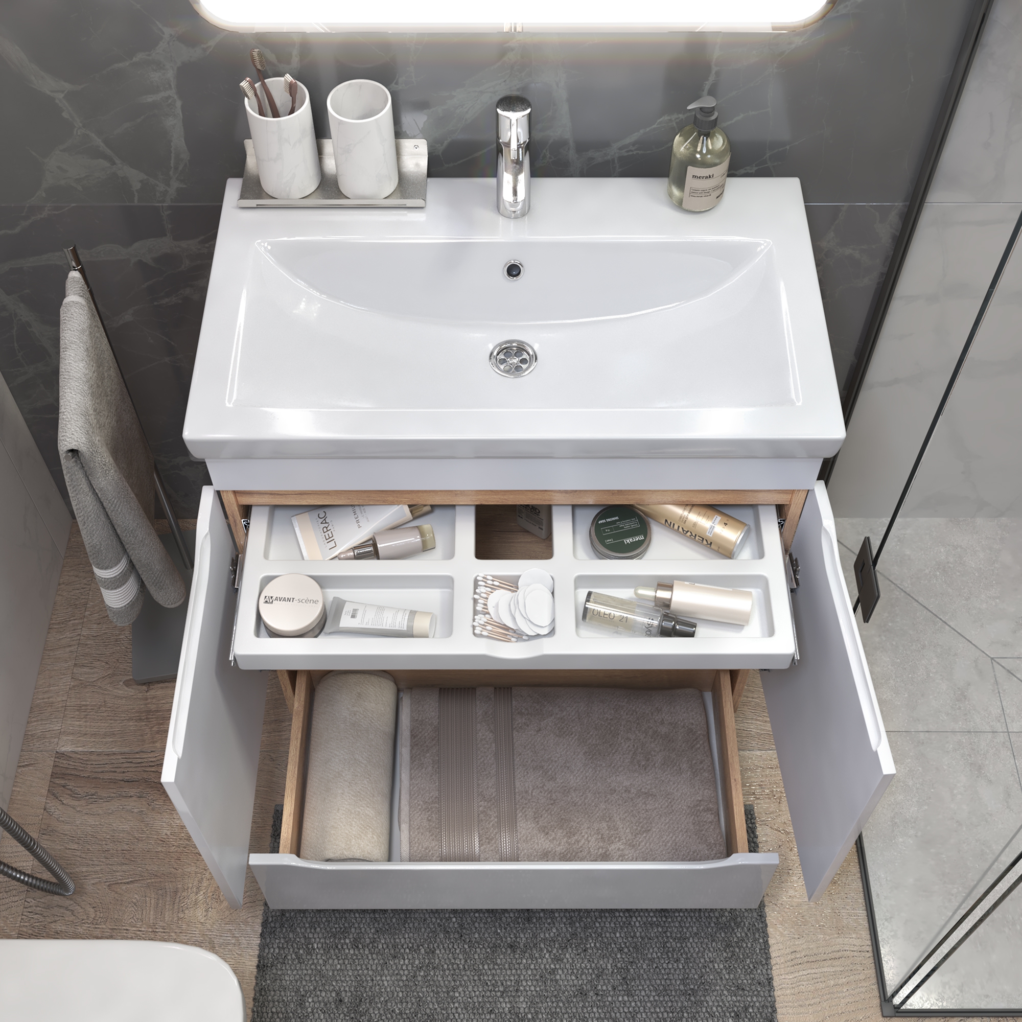 Тумбы Grani оснащены удобным органайзером, который позволяет легко находить и доставать необходимые вещи. Мебель оснащена шариковыми направляющими полного выдвижения, что обеспечивает плавный и бесшумный ход ящика. Еще более комфортное использование мебели делают интегрированные ручки и дверные петли с доводчиком.