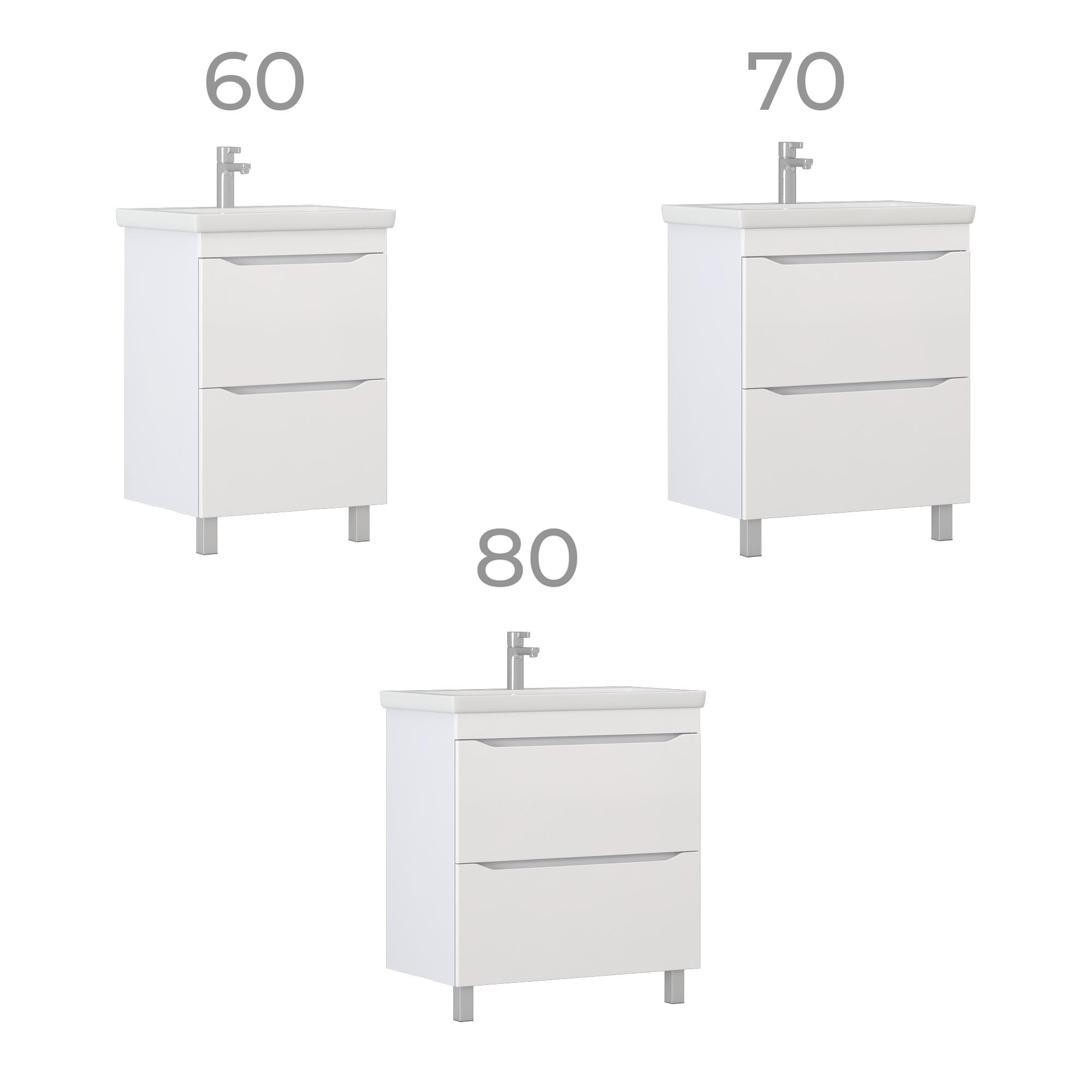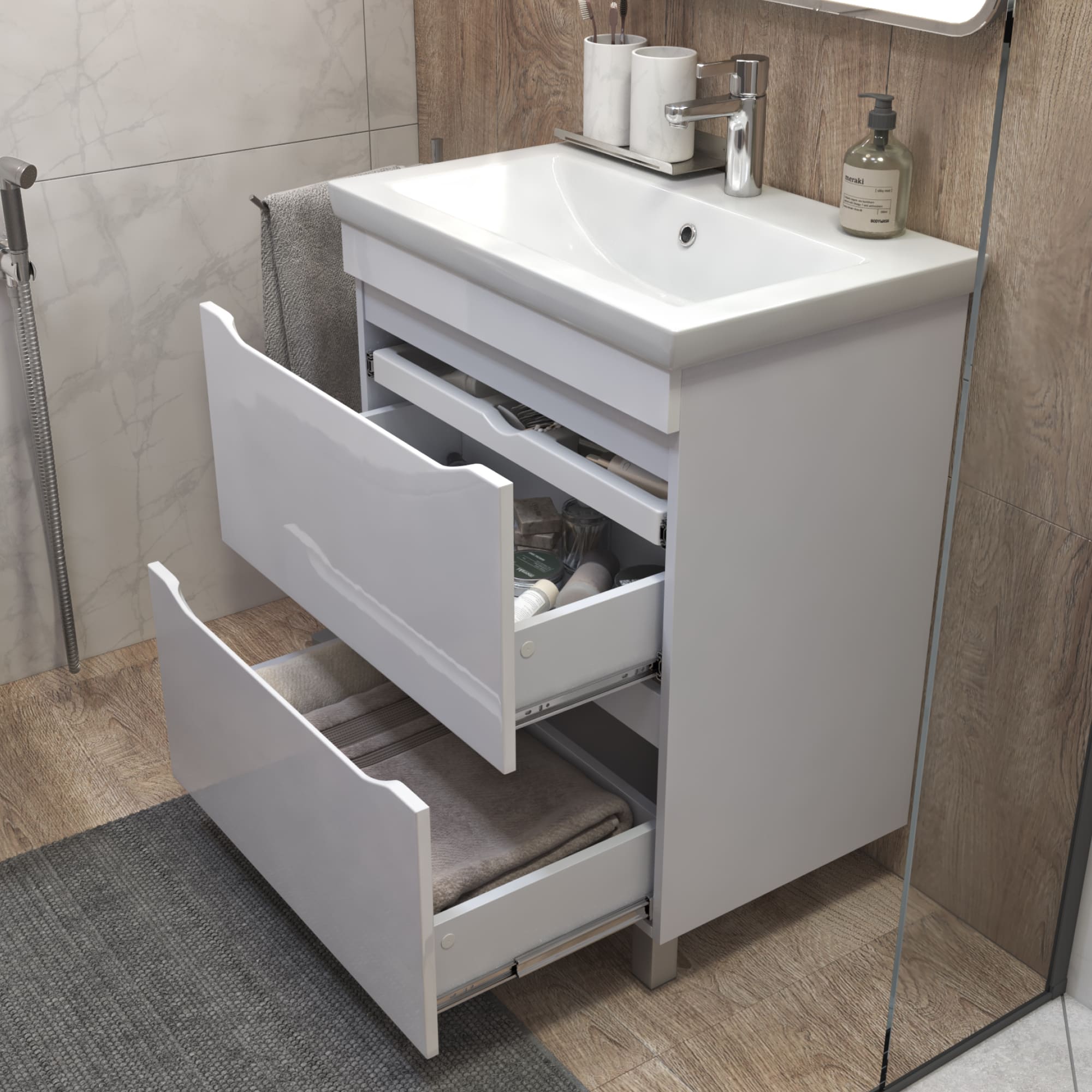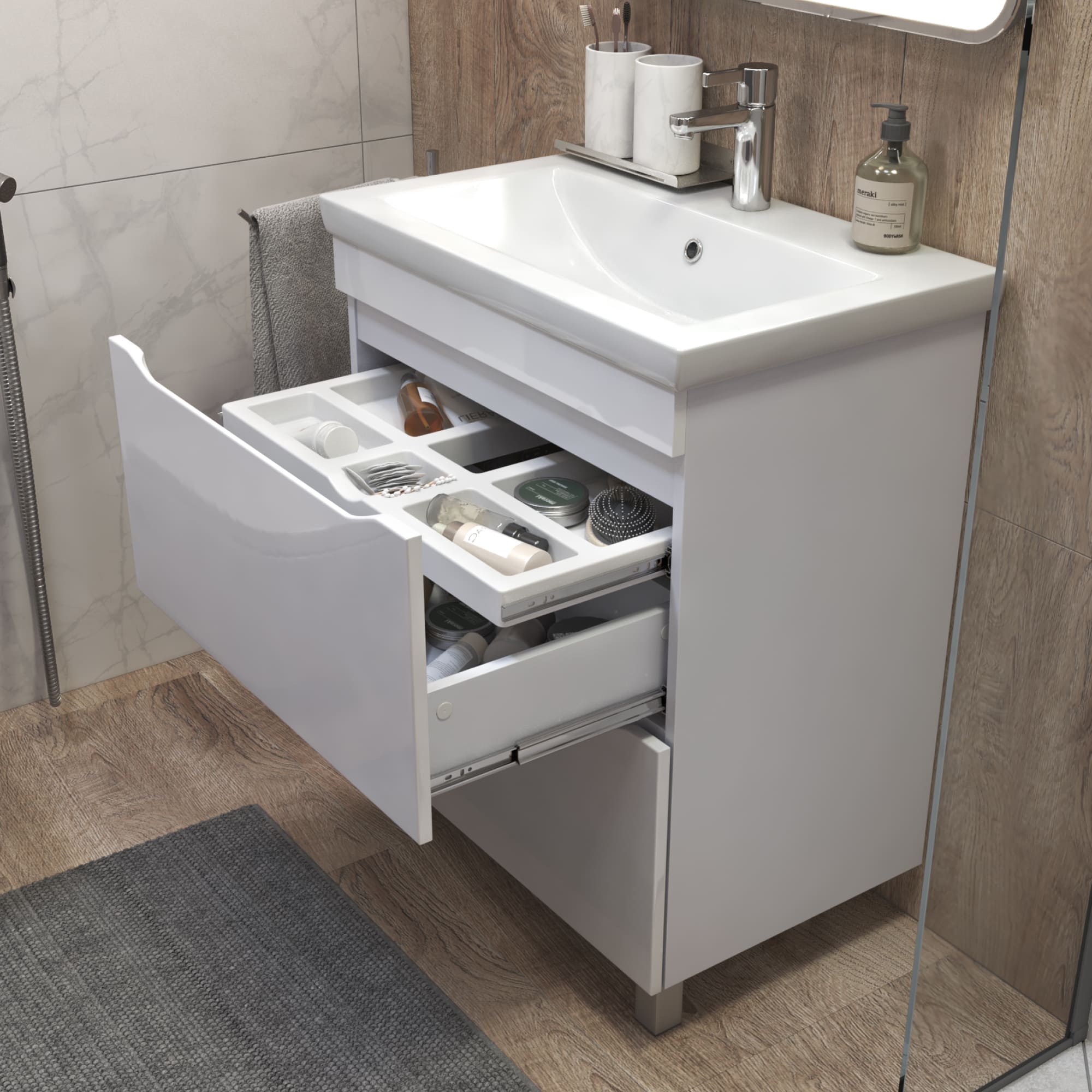 Оснащение: 2 ящика, выдвижной органайзер для мелочей, шариковые направляющие полного выдвижения, 2 опоры квадратные регулируемые, 1 сифон