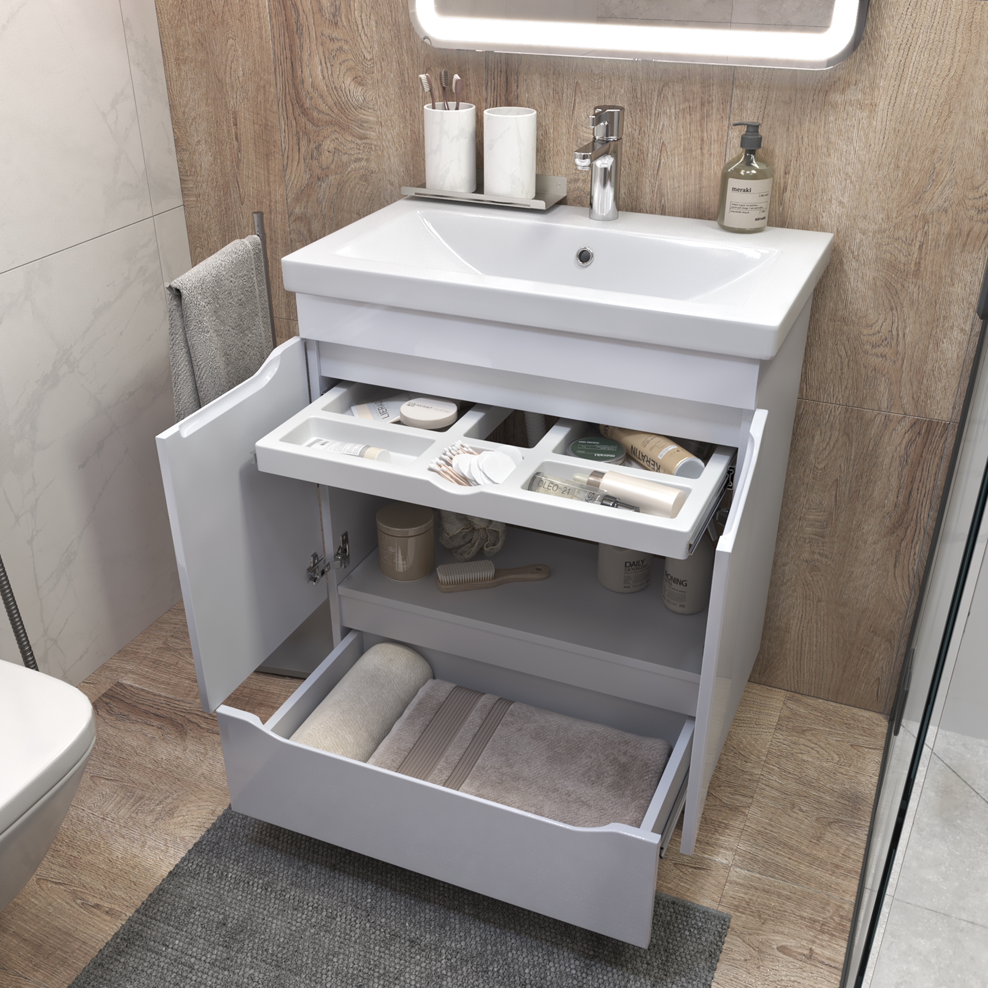 Тумбы Grani оснащены удобным органайзером, который позволяет легко находить и доставать необходимые вещи. Мебель оснащена шариковыми направляющими полного выдвижения, что обеспечивает плавный и бесшумный ход ящика. Еще более комфортное использование мебели делают интегрированные ручки и дверные петли с доводчиком.