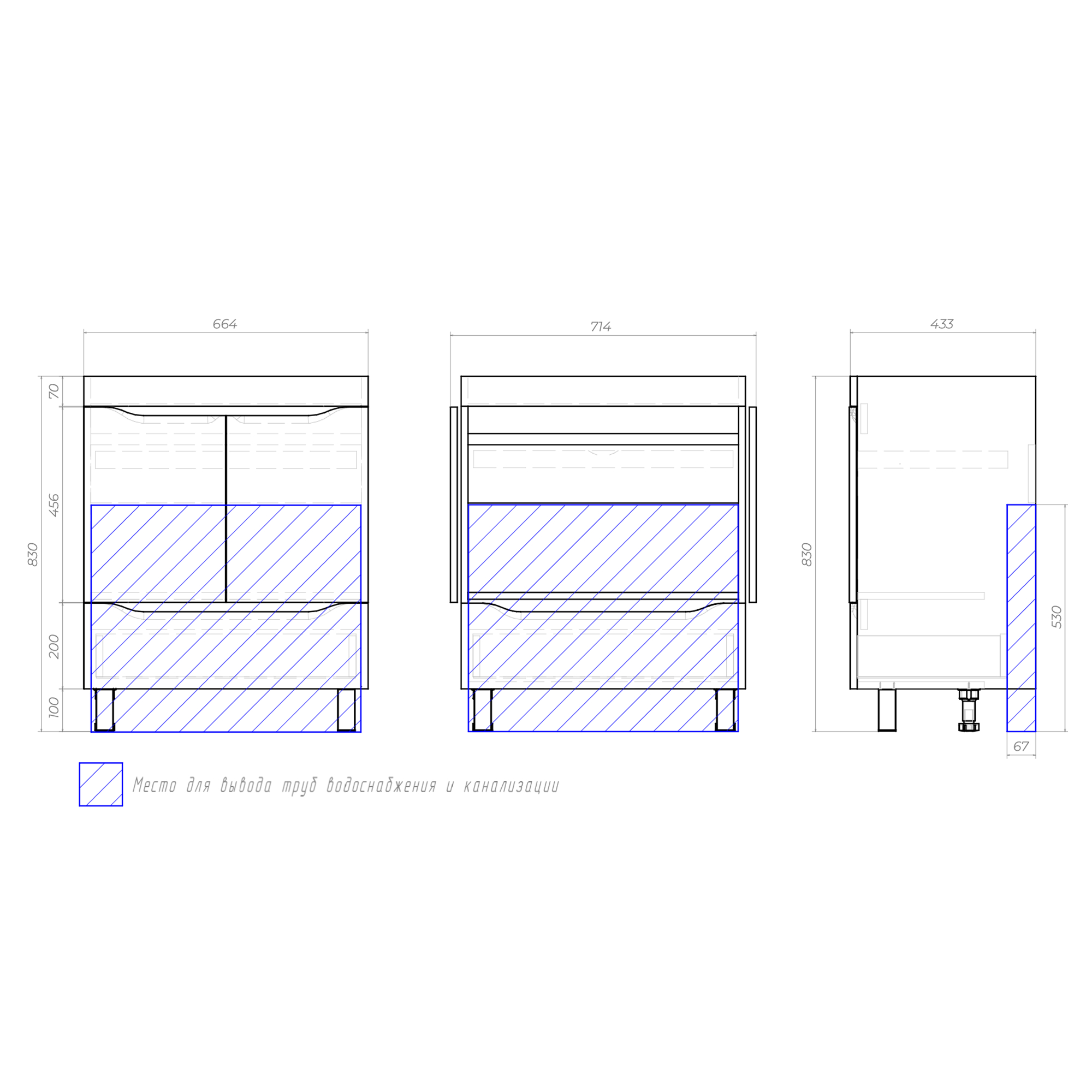 Оснащение: 2 дверцы, петли с механизмом доводчика, 1 ящик, выдвижной органайзер для мелочей, шариковые направляющие полного выдвижения, 2 опоры квадратные регулируемые; 2 кухонные опоры