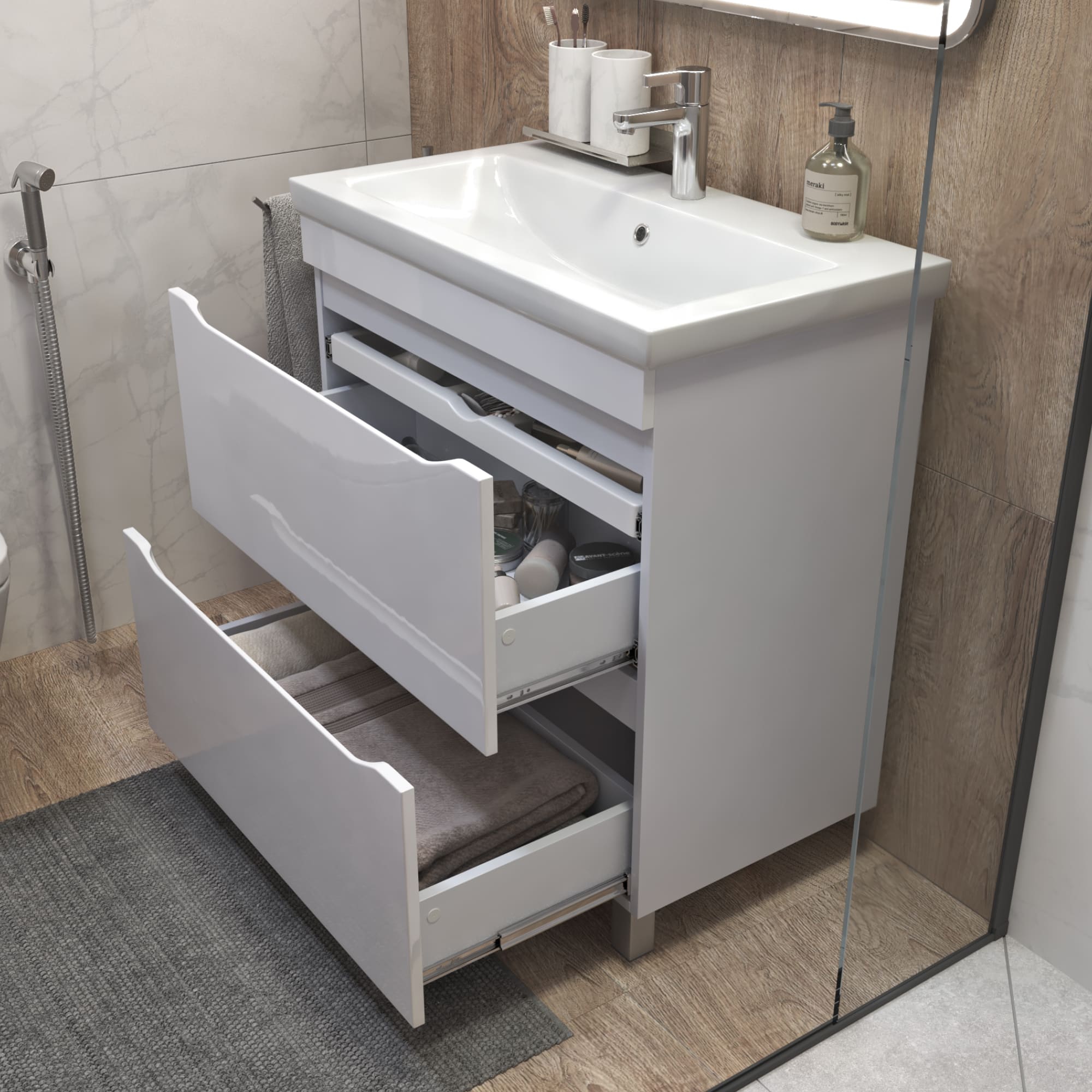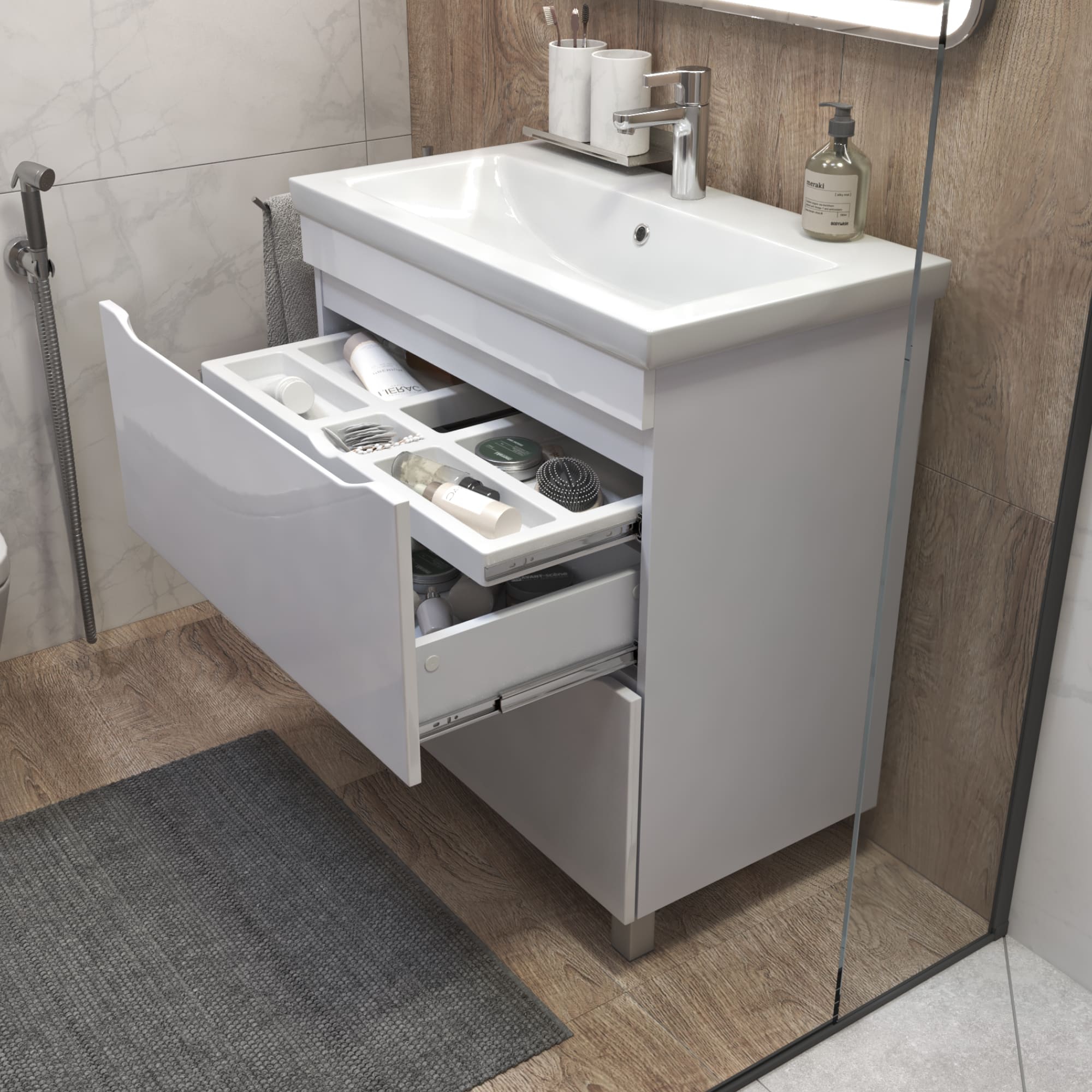 Тумбы Grani оснащены удобным органайзером, который позволяет легко находить и доставать необходимые вещи. Мебель оснащена шариковыми направляющими полного выдвижения, что обеспечивает плавный и бесшумный ход ящика. Еще более комфортное использование мебели делают интегрированные ручки и дверные петли с доводчиком.