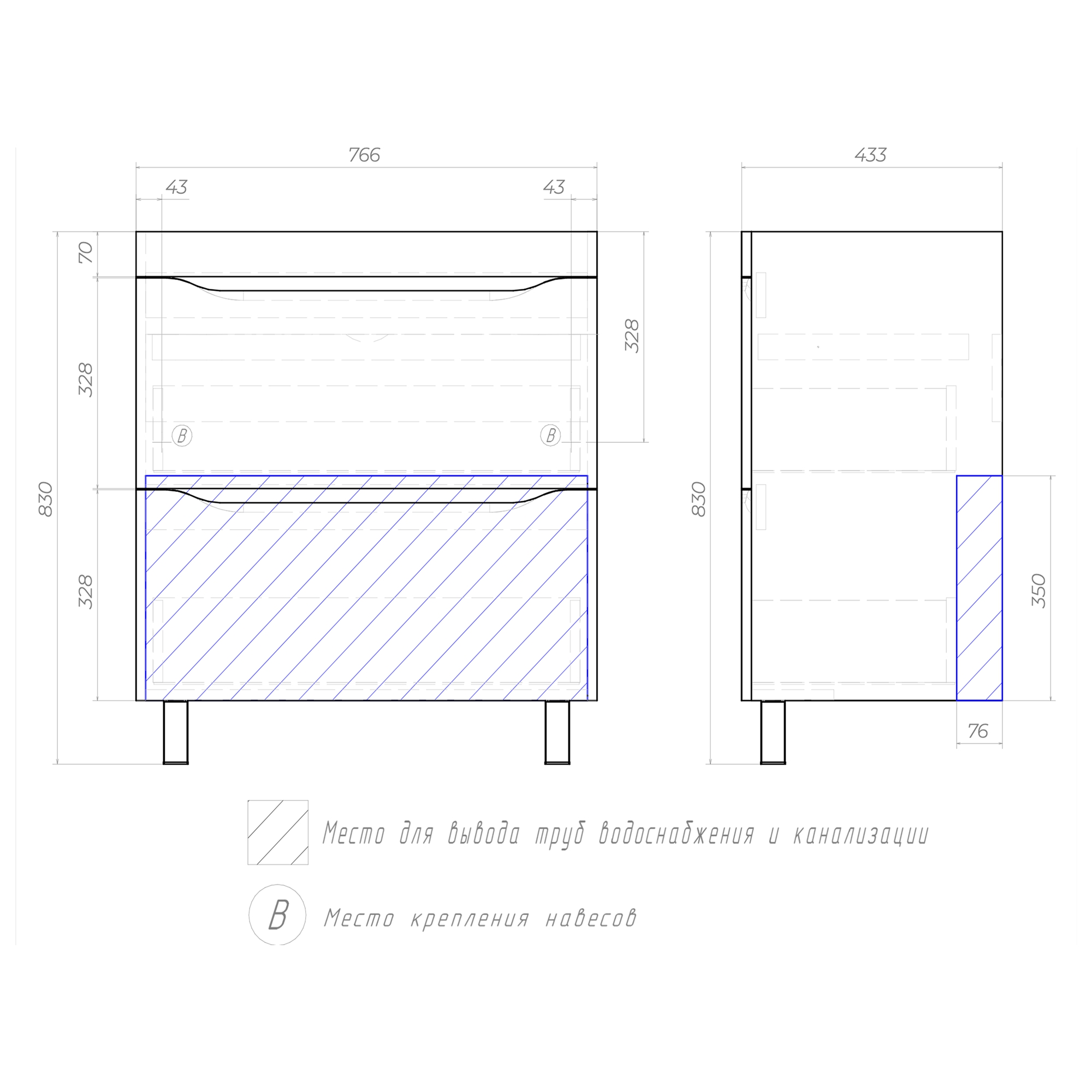 Оснащение: 2 ящика, выдвижной органайзер для мелочей, шариковые направляющие полного выдвижения, 2 опоры квадратные регулируемые, 2 навеса, 1 сифон