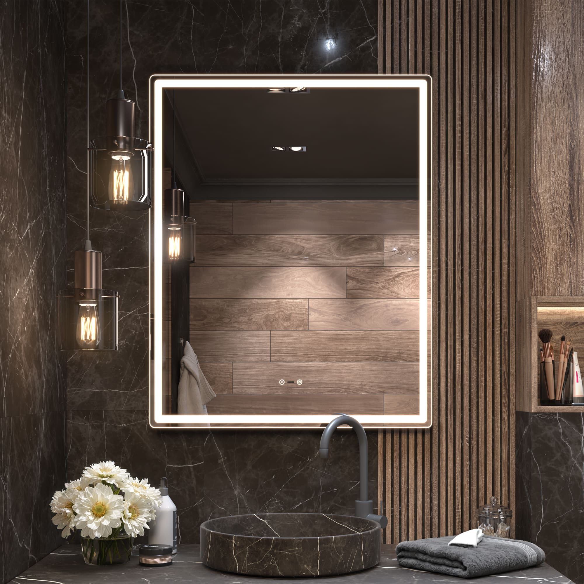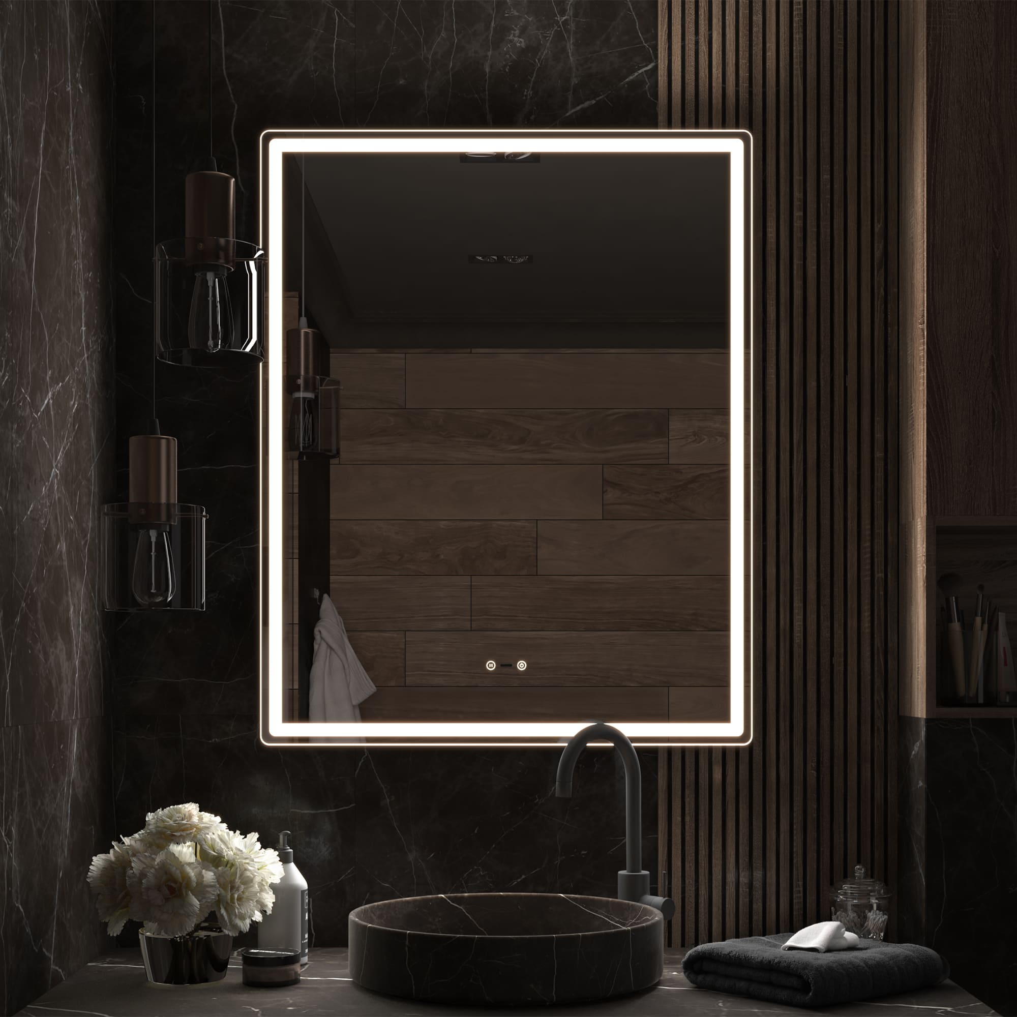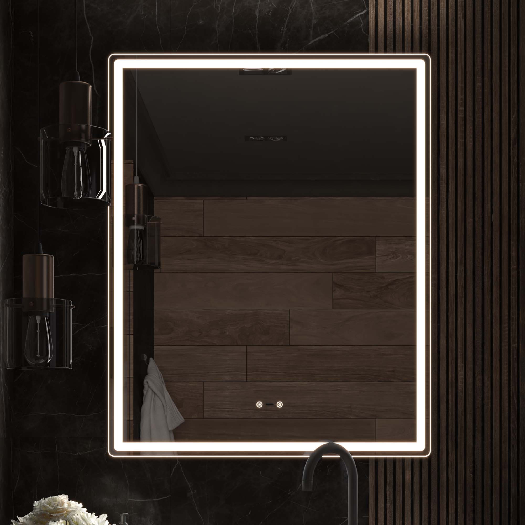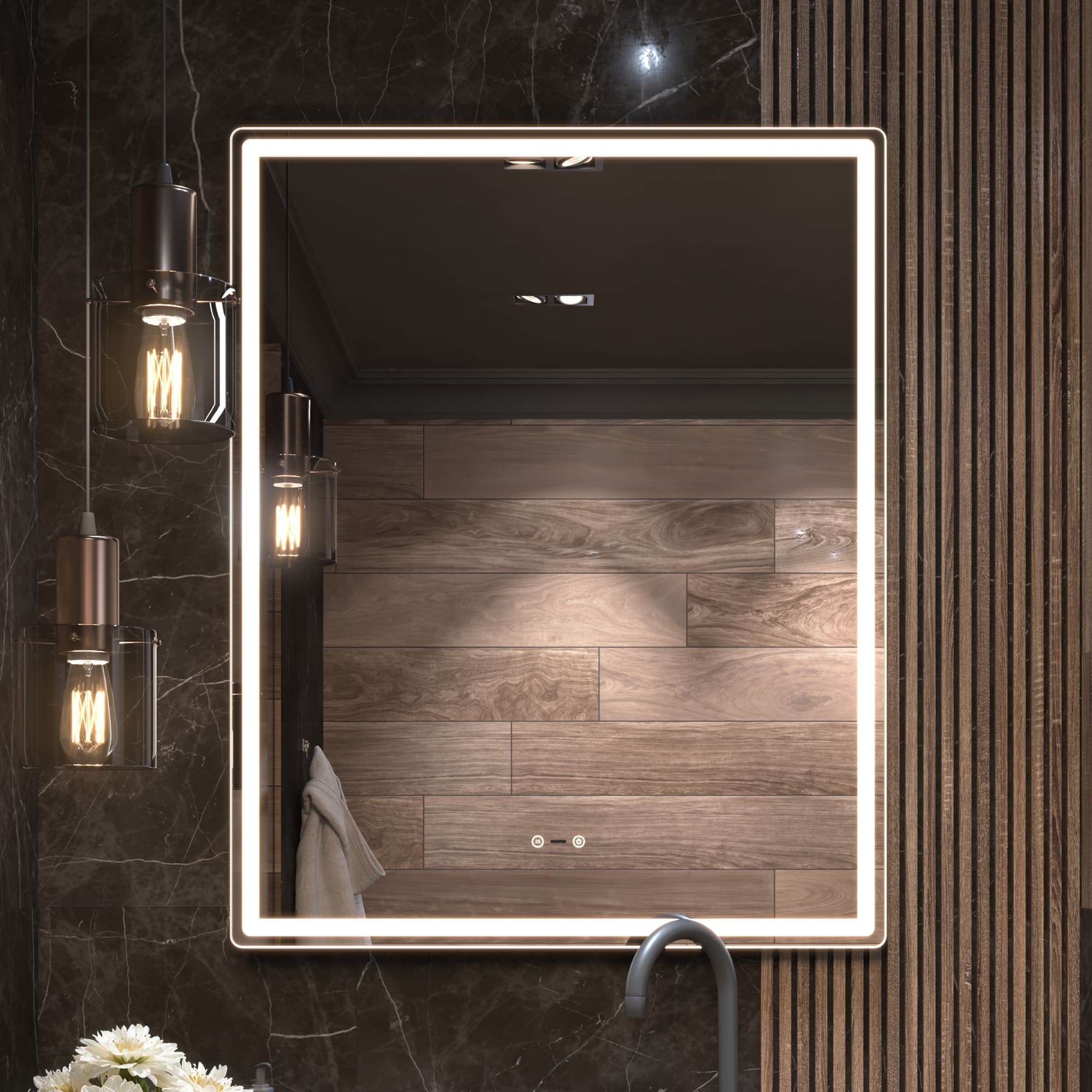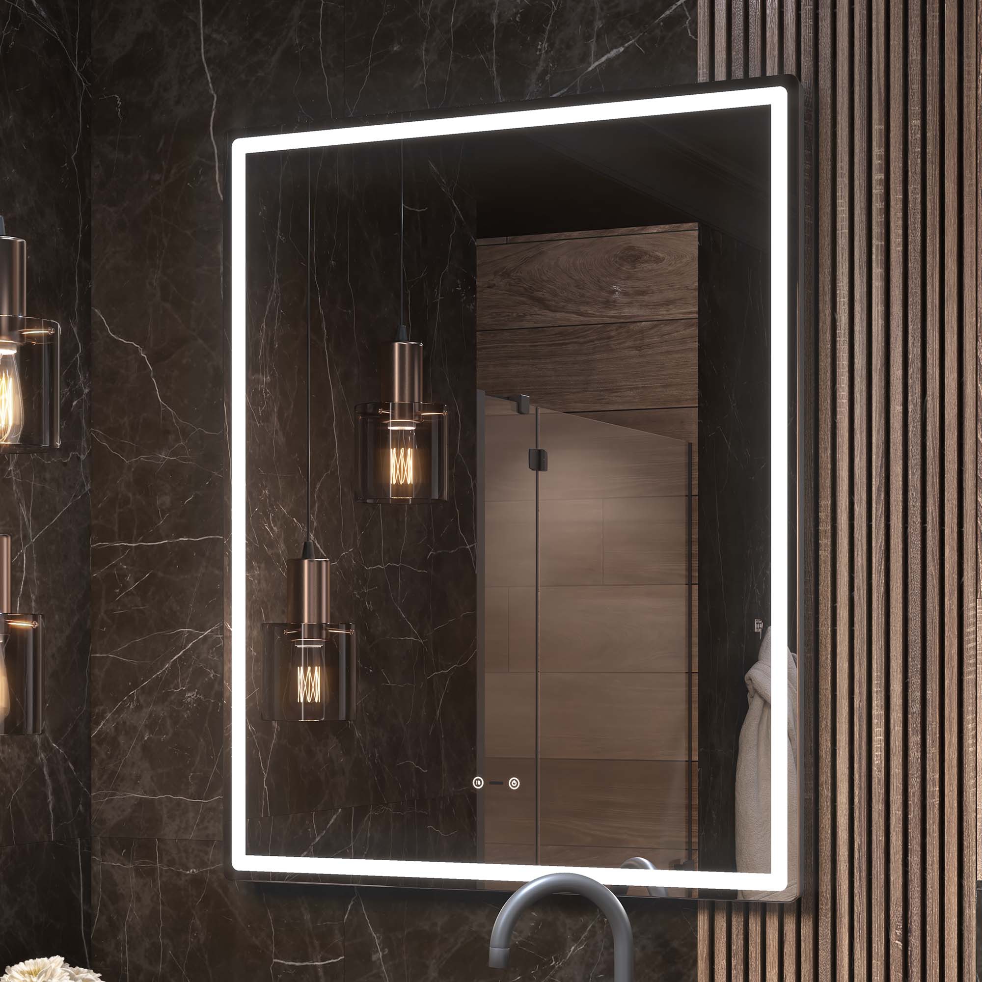 Оснащение: Датчик присутствия, сенсорное управление, светодиодная подсветка, диммер, функция антизапотевания